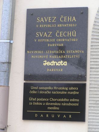 Tredelad skylt: Tjeckernas förbund - Jednota - kontor för de tjeckiska och slovakiska minoriteternas representant i det kroatiska parlamentet.