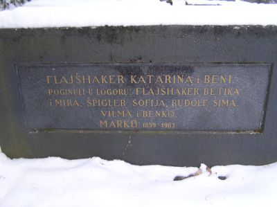 "Flajšhaker, Katarina och Beni (...)". Därefter: "Dog i läger: Flajšhaker Betika och Mira  (...)".