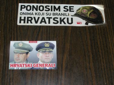 På järnvägskaféet såg jag två dekaler, uppklistrade på en vägg. Det var kvällstidningen Večernji List som stod bakom dem. På den ena kunde man läsa: "Jag är stolt över dem som försvarade Kroatien". Den andra visade Markač och Gotovina och hade texten "kroatiska generaler". På andra ställen såg jag dekaler med texten "Gotovina – heroj" (Gotovina – hjälte). I början av min resa, när jag åkte buss från Zagrebs flygplats in till centrum, upptäckte jag följande klotter på en byggnad: "Sretan rodjendan – Gotovina – Heroj" (Grattis på födelsedagen – Gotovina – hjälte).