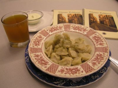 På Bazilijonų-gatan som sträcker sig västerut från Aušros Vartų (Gryningsporten) i Vilnius hittade jag en mycket enkel och trivsam restaurang som serverade litauisk husmanskost. Jag åt en sallad samt cepelinai som är ett slags kroppkaka. Cepelinai betyder zeppelinare, det är kroppkakans form som givit den dess namn.