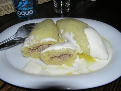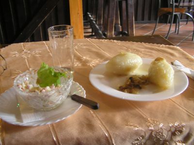 Lunch bestående av cepelinai på en restaurang i Kaunas specialiserad på traditionella litauiska rätter.