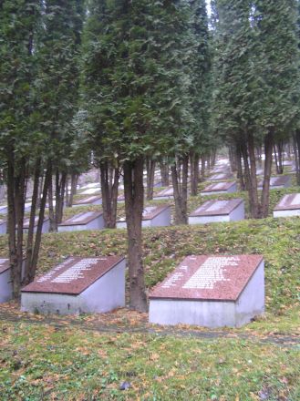 På sluttningarna bakom och till höger om monumentet är små tavlor utlagda, i symmetriska rader, med namn på sovjetiska soldater. Över dem står kuperade träd i stram givakt, symmetriskt planterade också de.